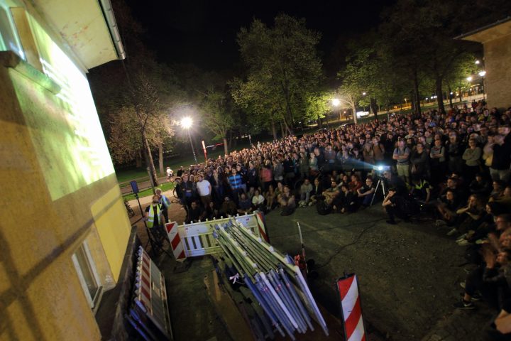 Allgemein zugänglich, also kostenlos, war in diesem Jahr übrigens nicht nur das Open Air auf dem Neumarkt. Auch die Veranstaltung A Wall is a Screen, eine Mischung aus Stadtführung und Filmnacht, lockte am lauen Freitagabend tausende Besucher*innen an – circa 1.500, schätzte Peter Haueis von der veranstaltenden Hamburger Künstlergruppe, einige Zuschauer*innen vermuten noch mehr. So oder so war es Rekord, obwohl die Hamburger mit dem Konzept schon um die halbe Welt gereist sind. Sieben Stationen absolvierte die Gruppe auf ihrem Weg vom Rundkino – erstmals Spielstätte des Filmfestes anno 1990 – über Rathaus, Robotron-Kantine und Hygiene-Museum bis zum Georg-Arnhold-Bad. Die an die Häuserwände projizierten kurzen Spiel- und Animationsfilme schwankten dabei zwischen nachdenklich und lustig. Und die Besucher*innen gingen gegen 23 Uhr zufrieden wieder auseinander – vielleicht mit dem Festivaltrailer oder dem einen oder anderen Filmsong im Ohr.